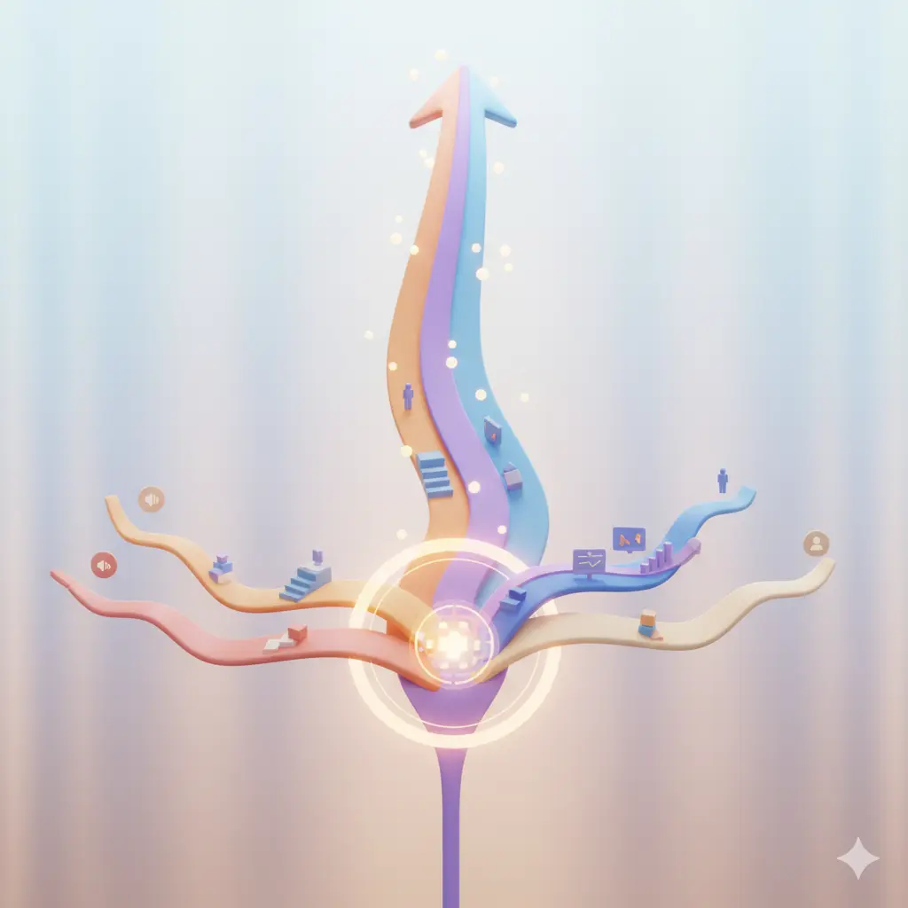 Verspreide puzzelstukjes transformeren naar verbonden digitaal breinnetwerk, symboliseert AI tools & lessons