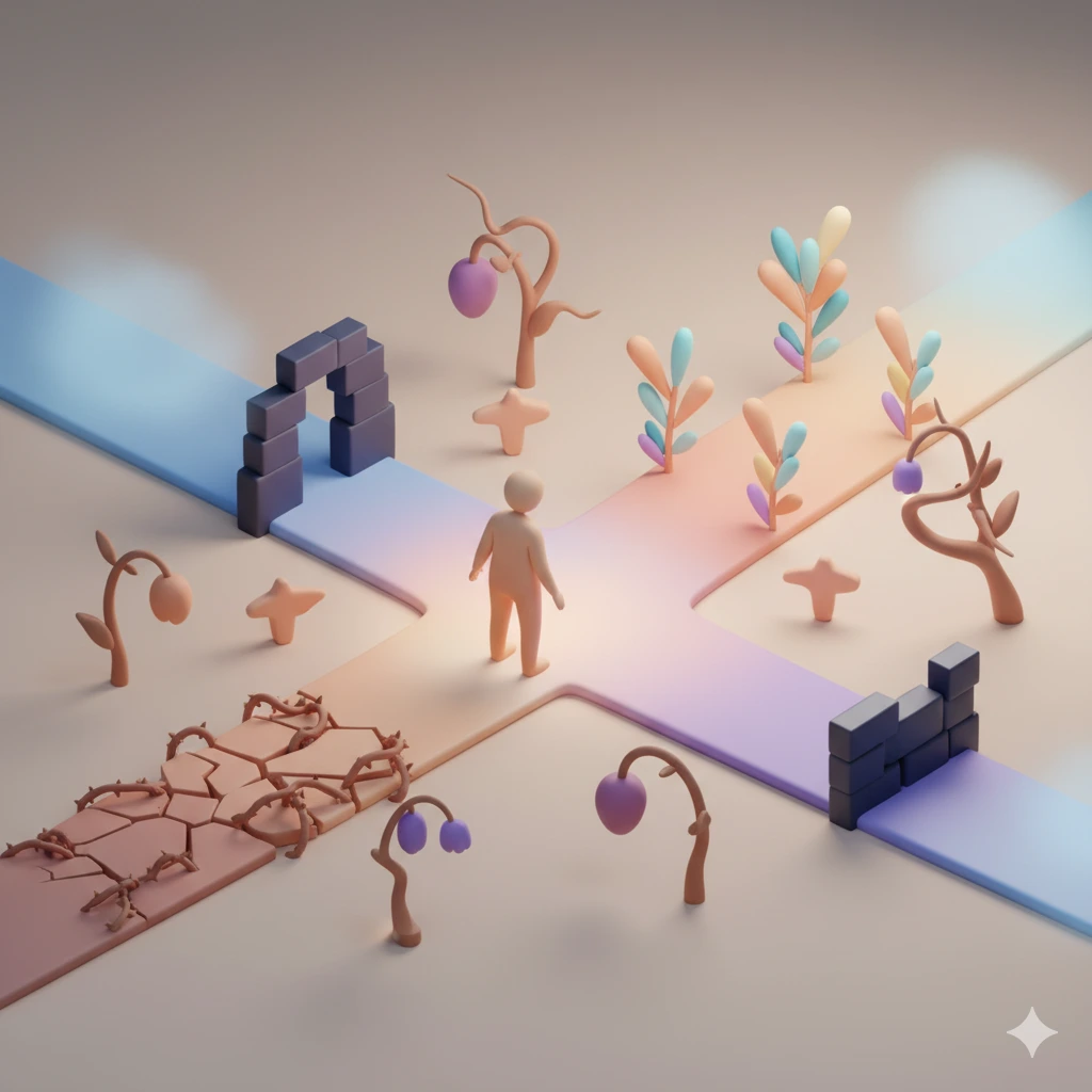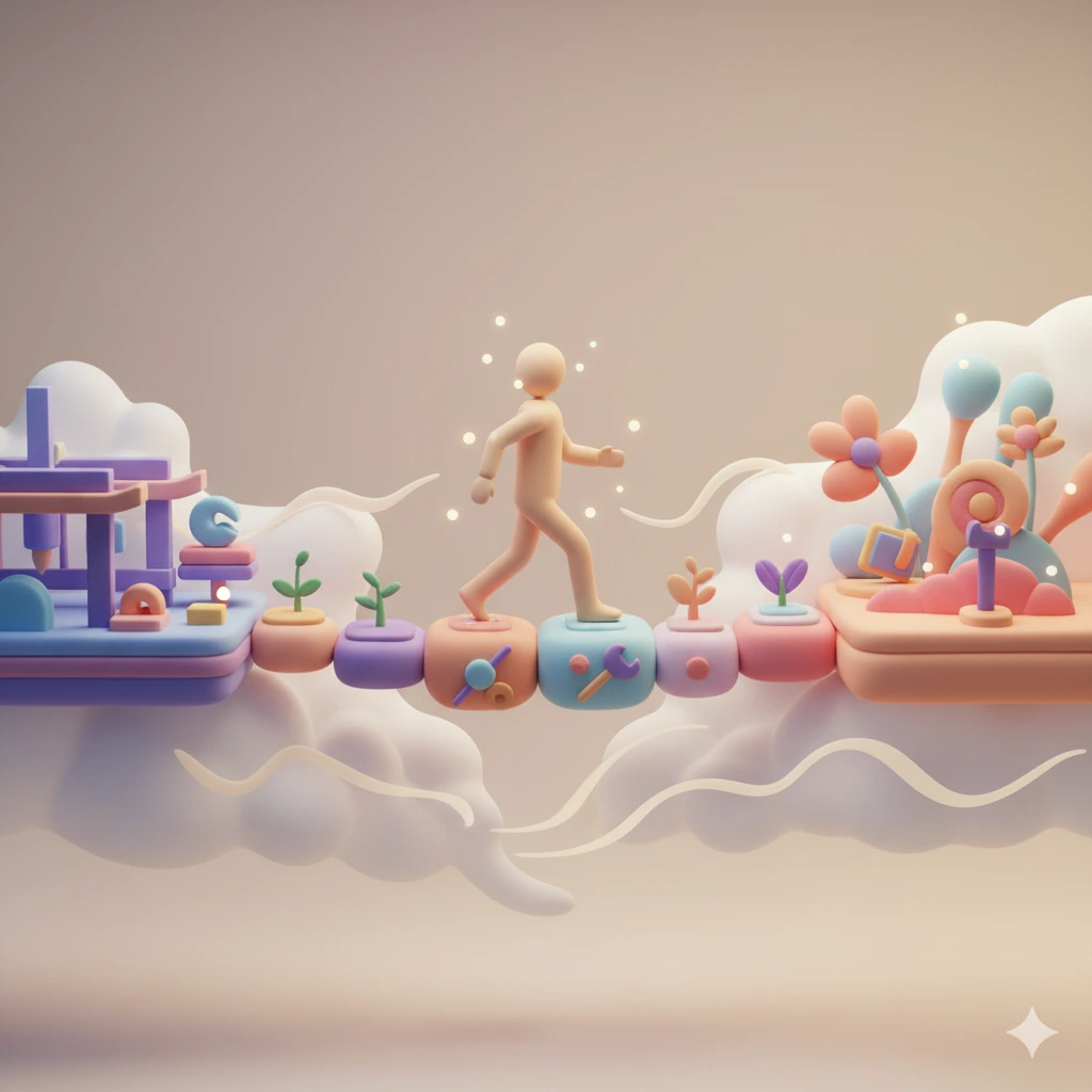 Pad met transformatie van kantoorgebouwen naar diverse carrièresymbolen, symboliseert carrièrewisselaars succesvol overstappen